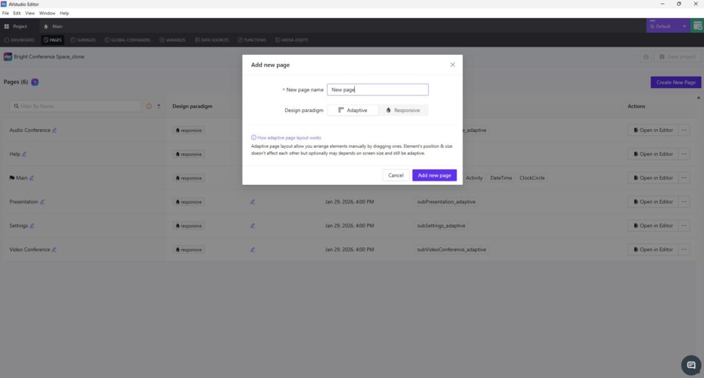 From the very beginning, AVstudio Editor was designed with the assumption that any interface built on the platform will need to exist on more than one screen. This is where Adaptive and Responsive page design comes in. These options allow layouts to adapt naturally to screen sizes, but they do so in different ways.